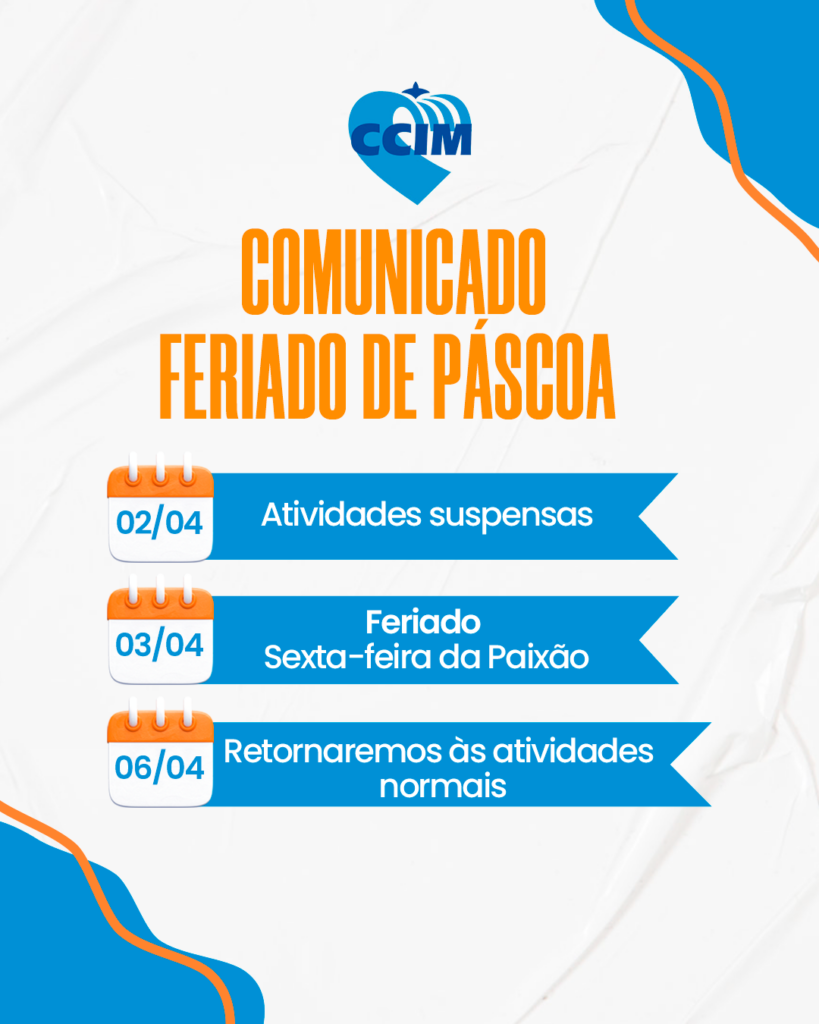 O CCIM informa as Atividades Suspensas, no Feriado de Páscoa: